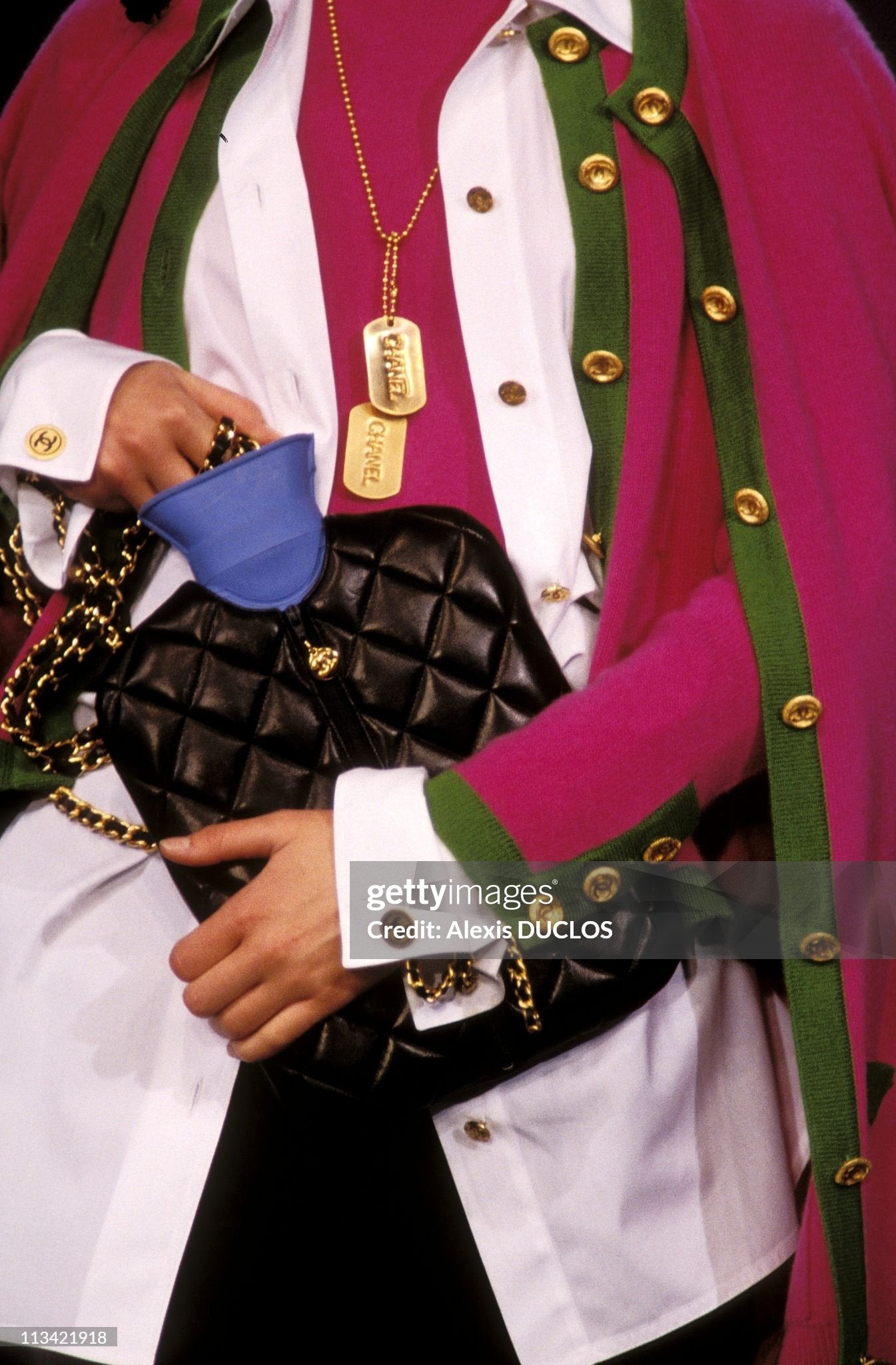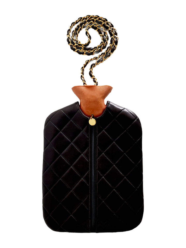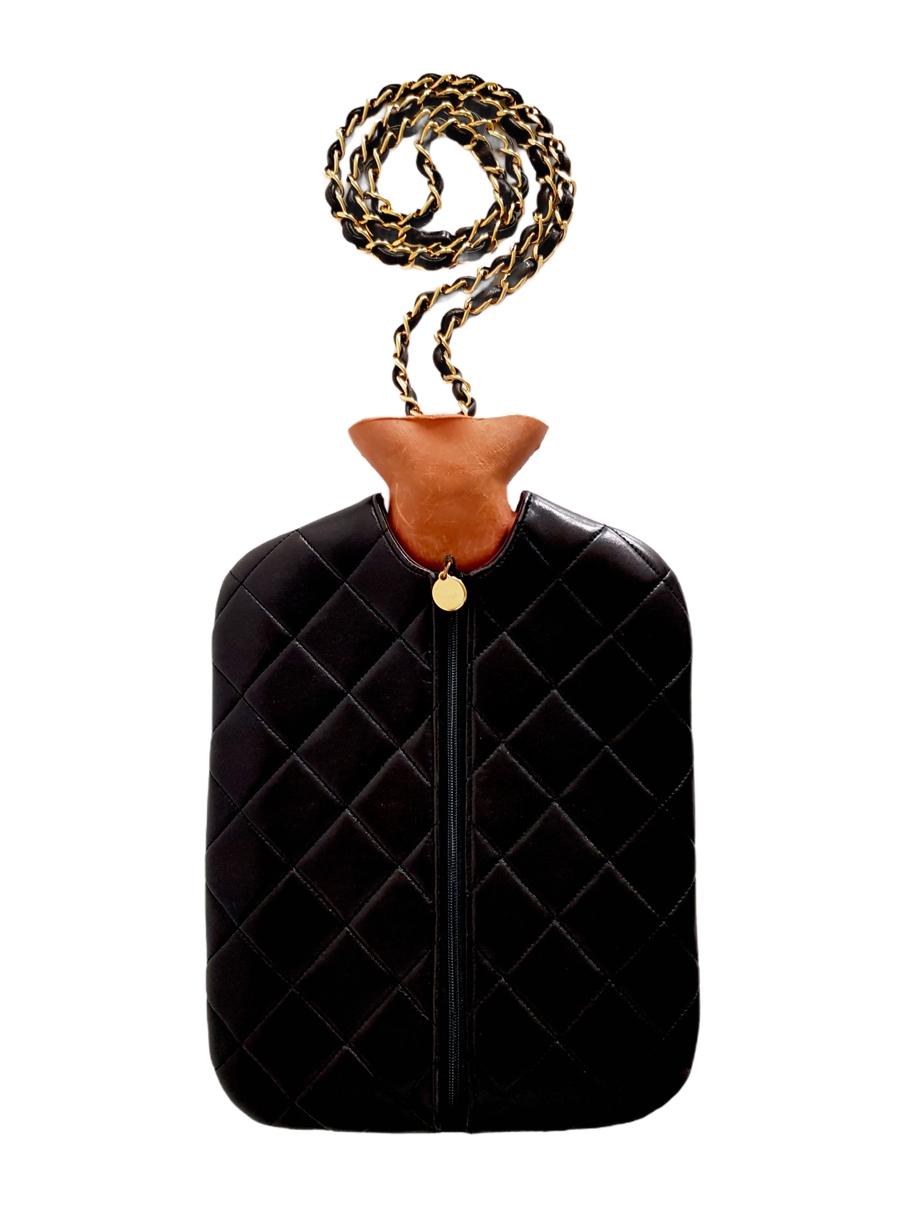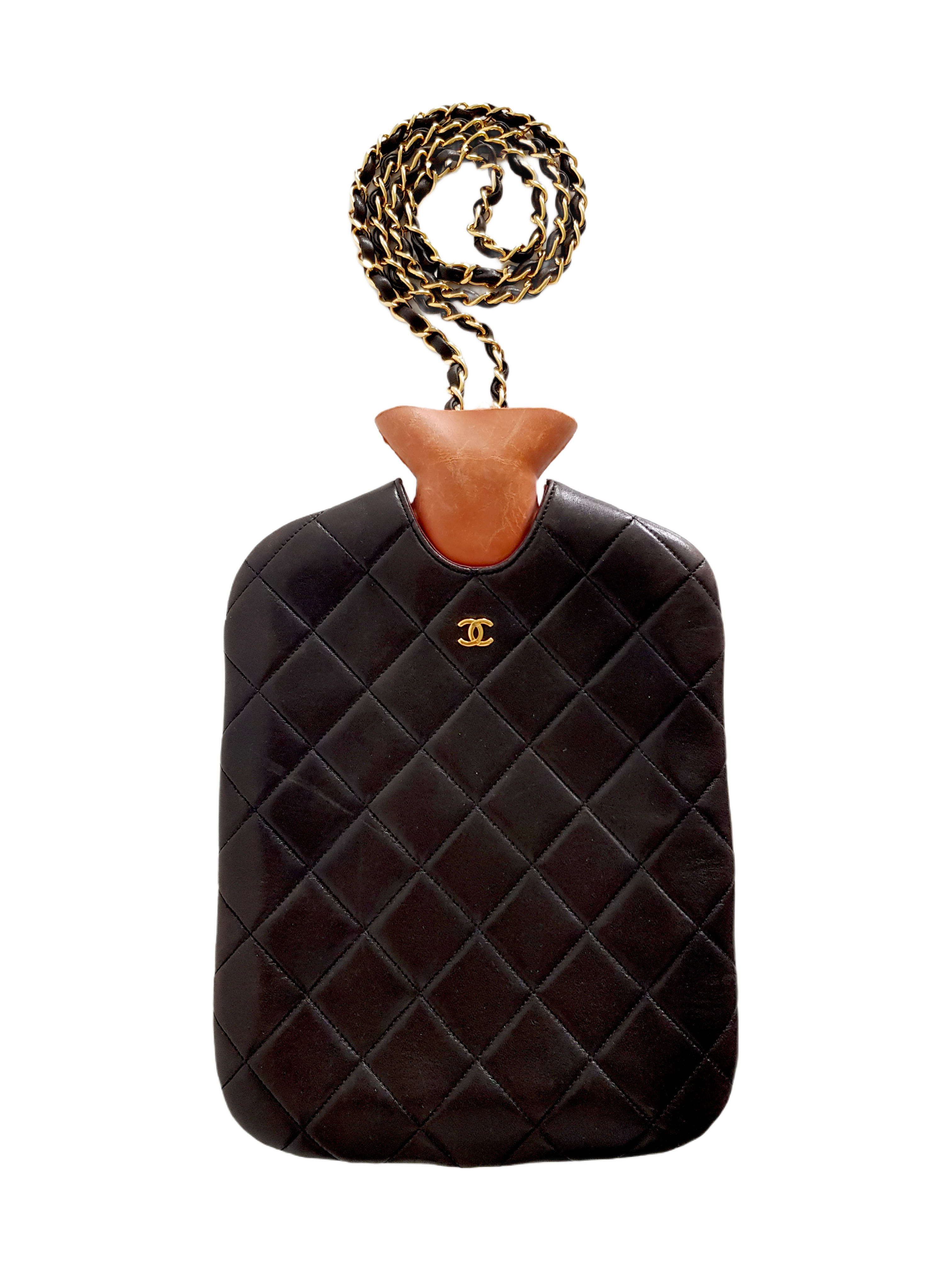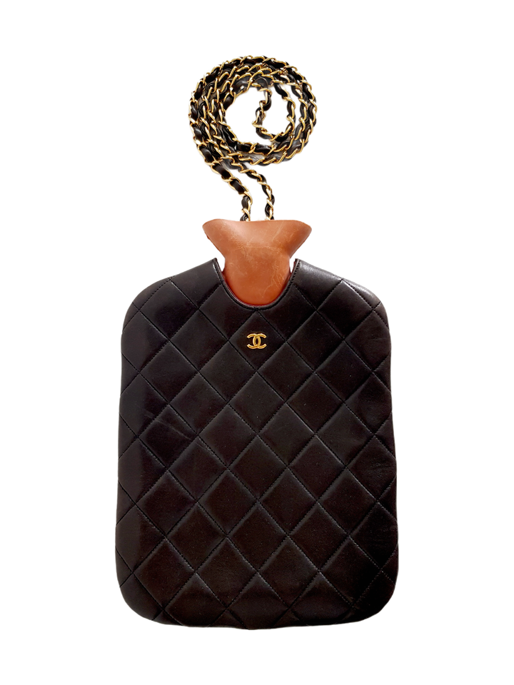 Black lambskin leather hot water bottle holder from Chanel’s Fall/Winter 1993 ready-to-wear runway show under the artistic direction of Karl Lagerfeld.