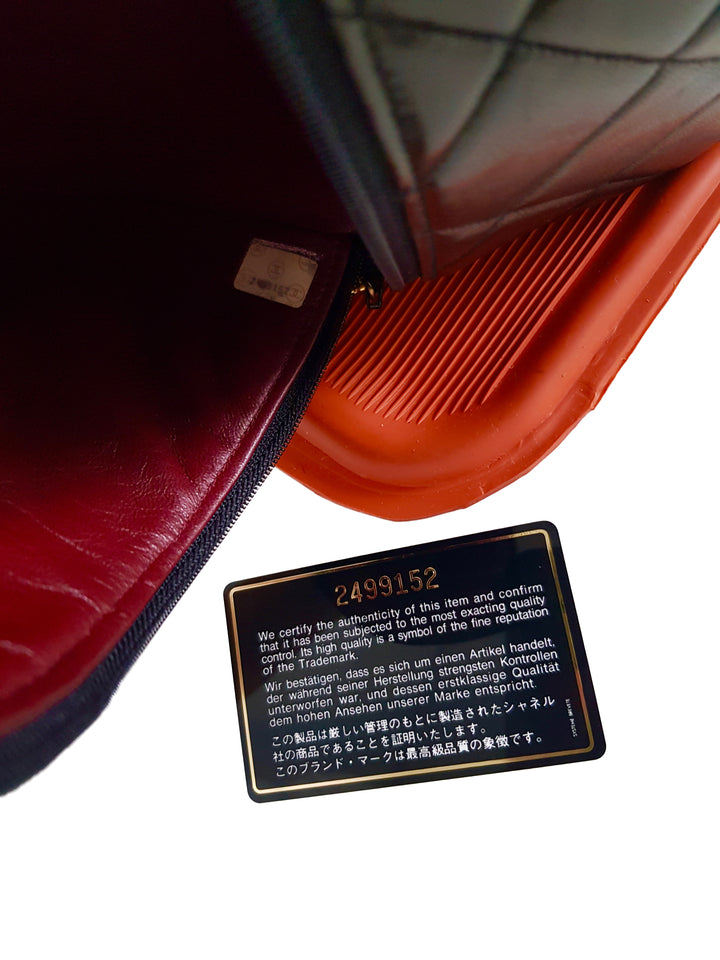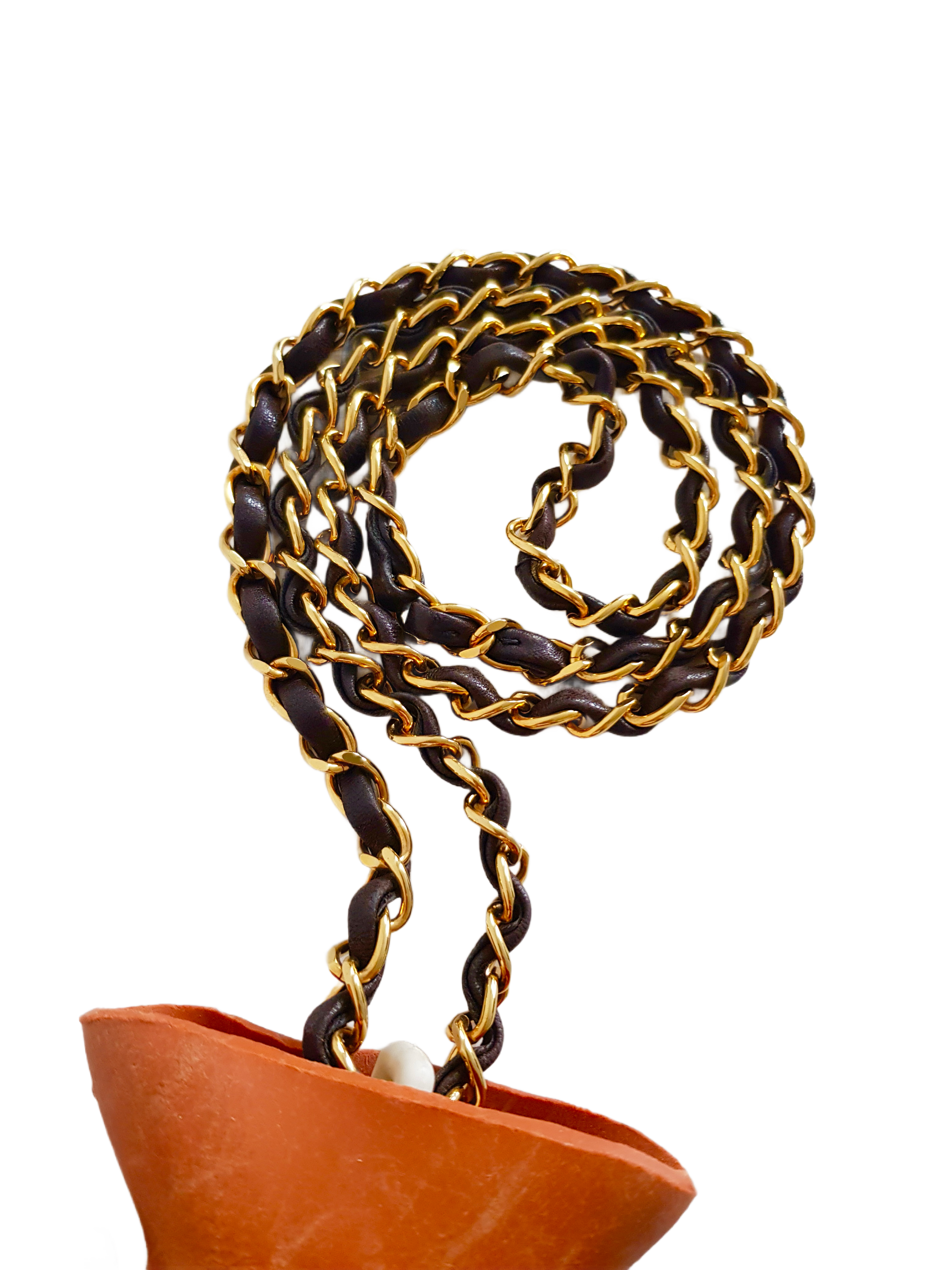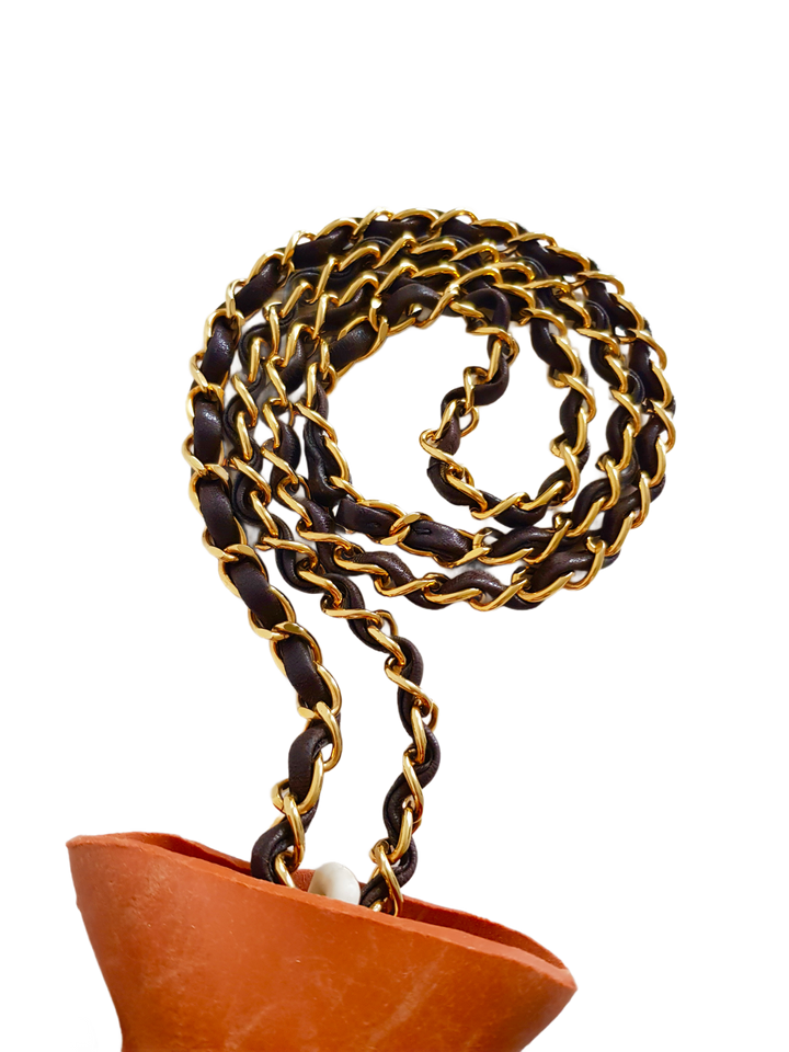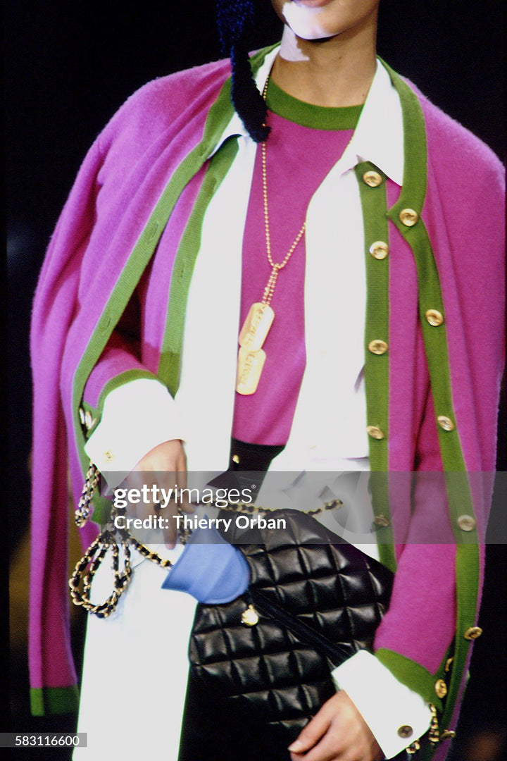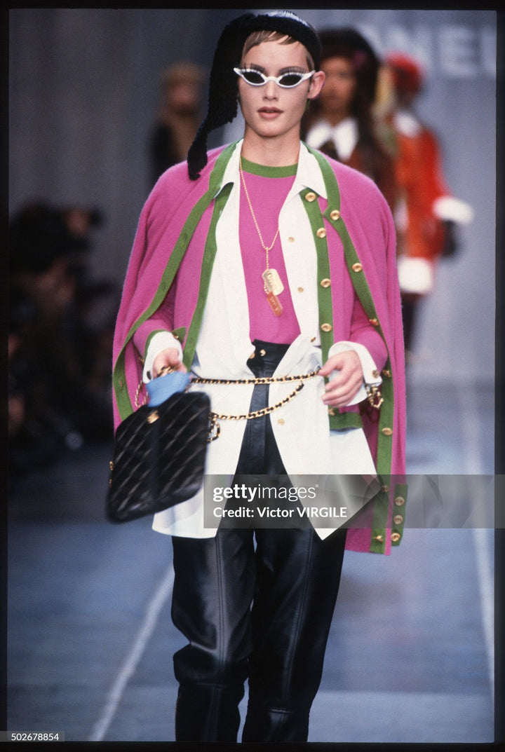Black lambskin leather hot water bottle holder from Chanel’s Fall/Winter 1993 ready-to-wear runway show under the artistic direction of Karl Lagerfeld.