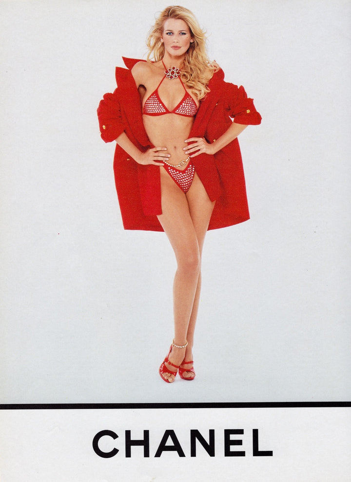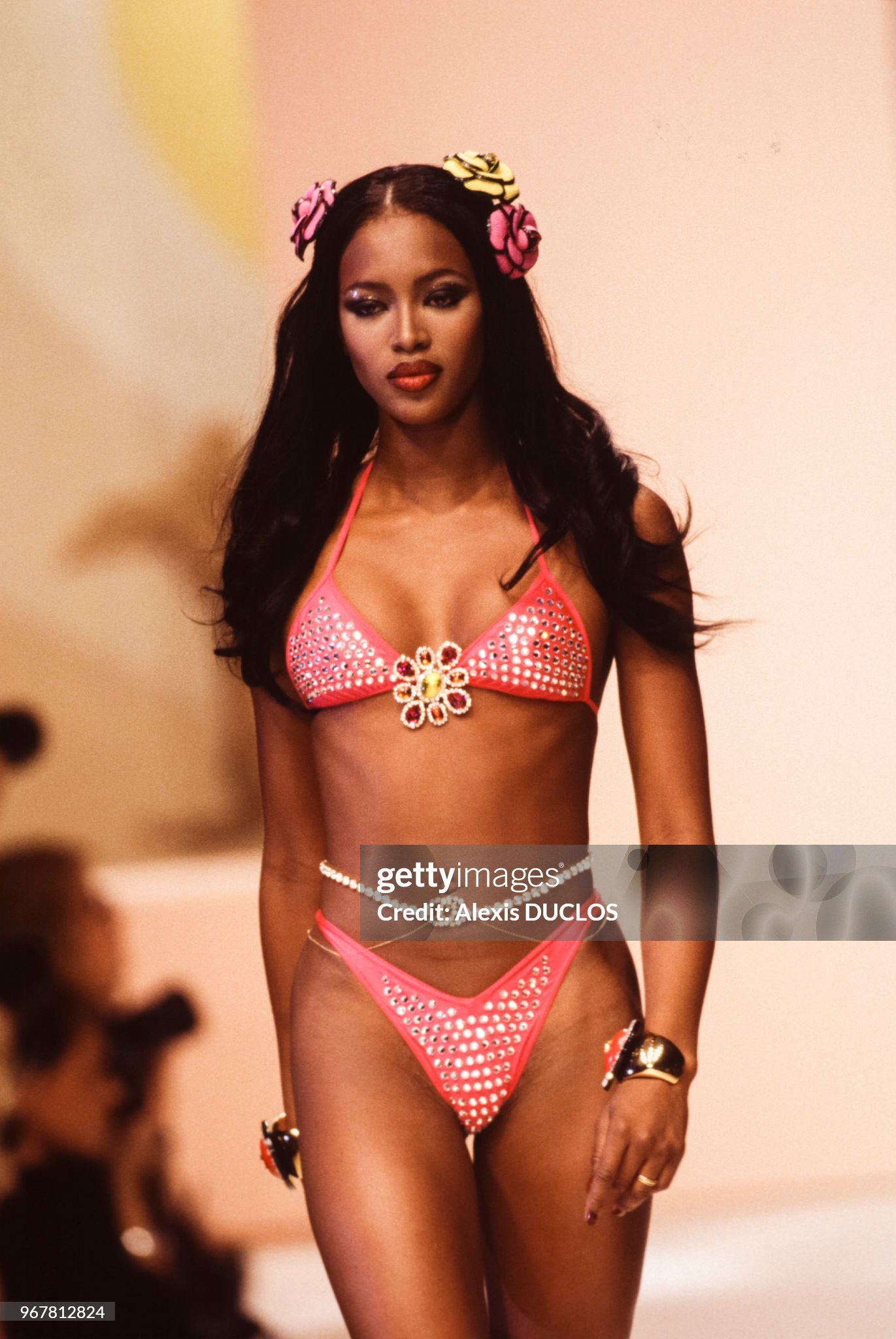 This famous bikini can be found all throughout the runway and the ad campaign at the time, in several colourways on supermodels Linda Evangelista, Claudia Schiffer and Naomi Campbell.